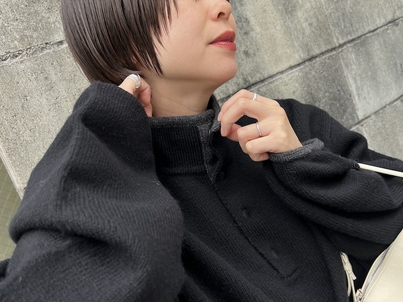 襟元のスナップや袖口のパイピングなどアウトドアウェアの雰囲気に、綺麗なハイゲージニットの組み合わせがバランスの良い1着。