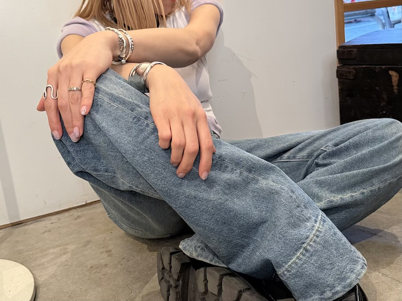 膝周りにツイストをかけたシルエットと裾にたまる独特の表情が特徴のツイストカットデニム。