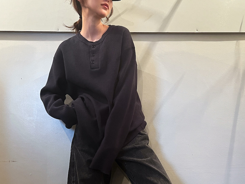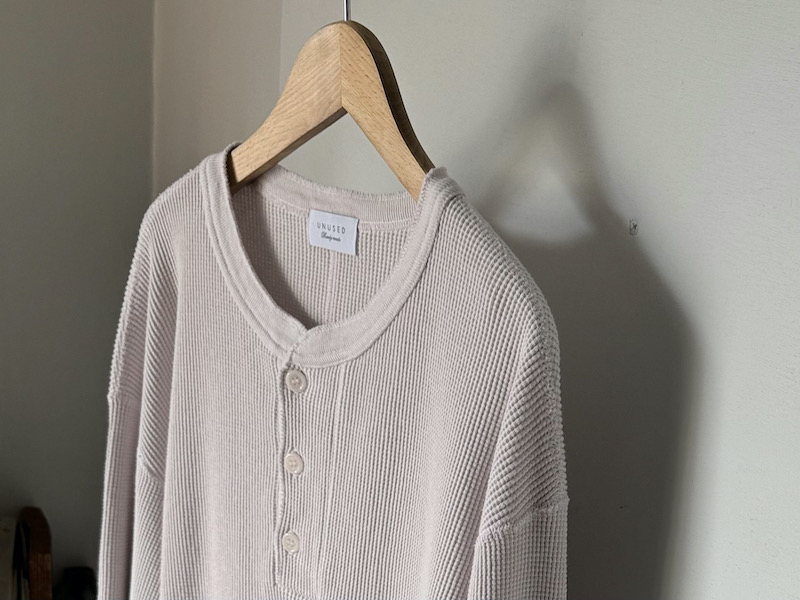 ONE WASHで仕上げたUNUSEDのヘンリーネックワッフルロングスリーブ。