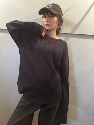LONG-SLEEVE HENRY NECK WAFFLE T-SHIRT -INK BLACK-【unused】